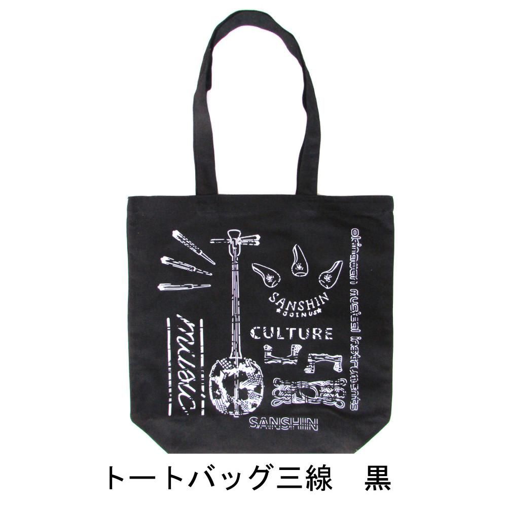〇トートバッグ三線:黒地に三線・爪・ウマ・糸掛け