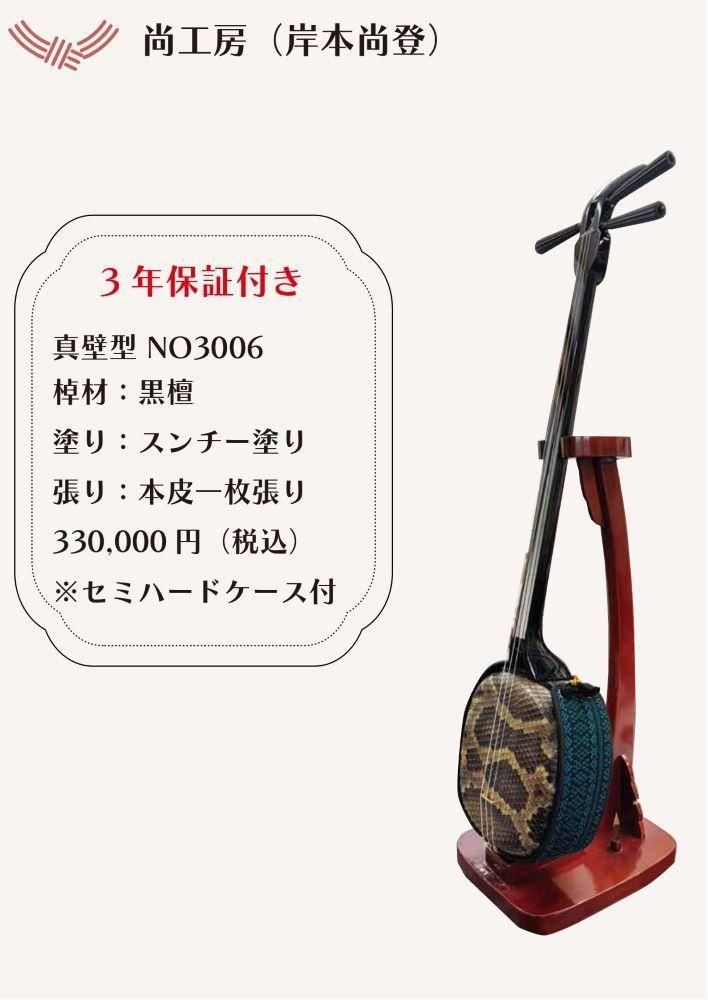 【3年保証付】 製作者:岸本尚登 ナンバリング:3006 型:真壁型 棹材:黒檀 塗り:スンチー塗り 張り:本皮一枚張り お得なケースセットでございます。 ・セミハードケース(色:黒or赤)赤をご希望の方は ショッピングカート画面のご要望欄に「ケース赤希望」と ご入力ください。入力がない場合は黒になります。 ・セミハードケース以外をご希望の方は料金が変わりますので ご注文前にメールでお問合せください。 注:爪・チルパック・ウマなどの小物類は付いていません。 :送料は別途発生します。